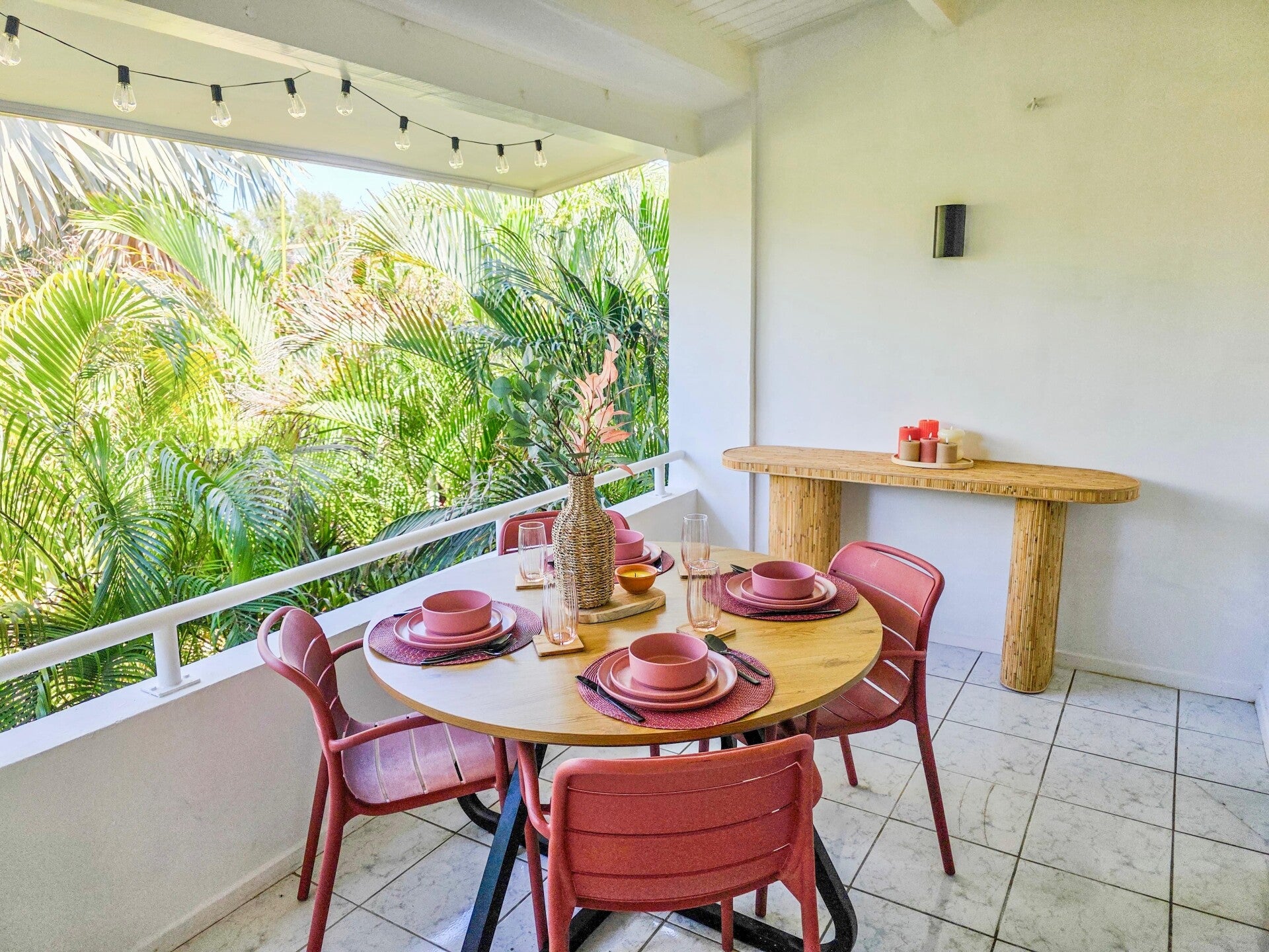 Eettafel voor 4 personen op het overdekte terras – ideaal voor ontbijt of diner in de buitenlucht.